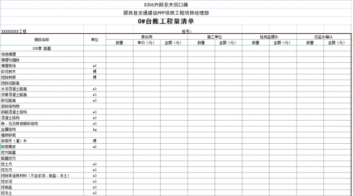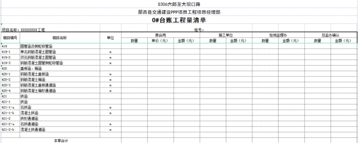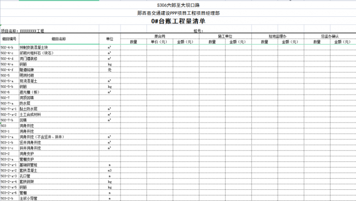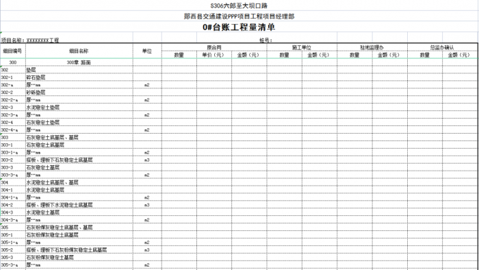 一個(gè)項(xiàng)目或一個(gè)合同段的臺(tái)賬由n條可以獨(dú)立計(jì)量的工程結(jié)構(gòu)(單元)組成,一般情況下一條臺(tái)賬應(yīng)包含子目號(hào)、子目名稱、單位、工程數(shù)量、單價(jià)、合價(jià)、里程樁號(hào)、工程部位描述、圖紙編號(hào)、備注說明等。